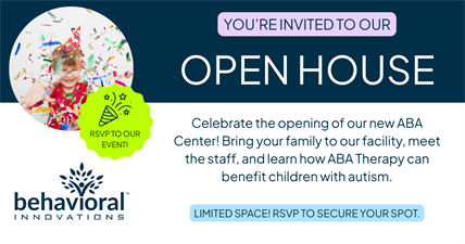 We invite you to join us for our open house celebration from 5–7 P.M., where you’re welcome to stop by at your convenience. Kids are welcome, and our therapists will be on-site to engage them with sensory-friendly activities. Light snacks will be provided, and we look forward to welcoming families, healthcare providers, and community partners. Behavioral Innovations is a provider of Applied Behavior Analysis (ABA) therapy across Texas, Oklahoma, Colorado, Virginia, North Carolina, and Maryland, offering center-based therapy for children ages 18 months to 10 years.