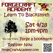 An hour of instruction and practice with blacksmithing with a take home forged piece followed by a glass of wine with the beautiful vineyard views of Penn Oaks Winery.